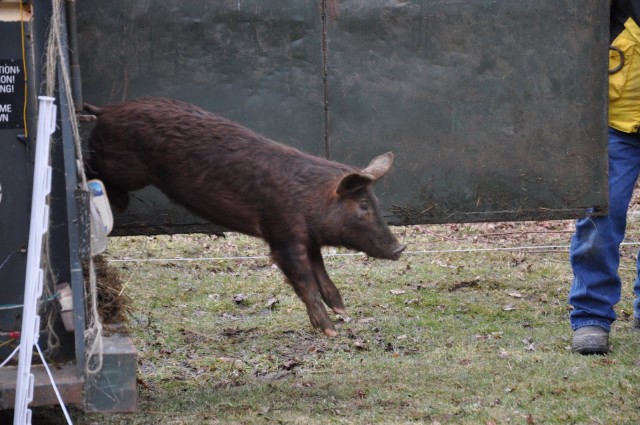 The pigs have arrived! Little by little my dream of creating a backyard farmyard is becoming a reality. It started with the chickens, then ducks, now PIGS! Thanks especially to our friends and neighbors who put in the fence and built a fabulous condo for the new residents. Couldn’t have done it without all their help and advice. The plan is to raise the buggers using mostly scraps from The Family Foundation School kitchen, supplement with feed and ship them off the butcher in the fall. My long-range goal is to fence in the back meadow – creating four sections – and rotate the area with pigs, grass, and goats. I was absolutely amazed at how efficient the pigs are at turning the soil. I had read that pigs make great rototillers, but until I saw them in action I had no idea how incredibly FAST they are at turning grubby grass into usable dirt.